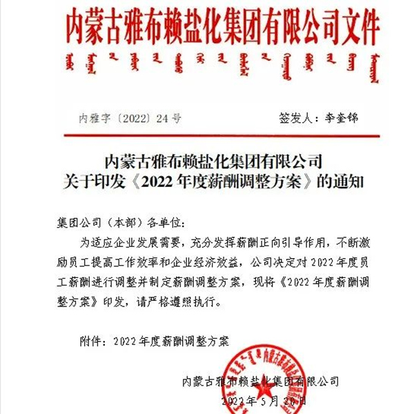 530日,雅盐化集团公司召开2022年第一次职工代表组长(扩大)会议,听取、审议并一致讨论通过了《集团公司本部2022年度薪酬调整的议案》。会议决定在2021年工资基础上,分别为中层管理人员、一般管理人员、生产人员、后勤服务人员等上调6%-8%的工资;为内退人员每人每月增资100元。
